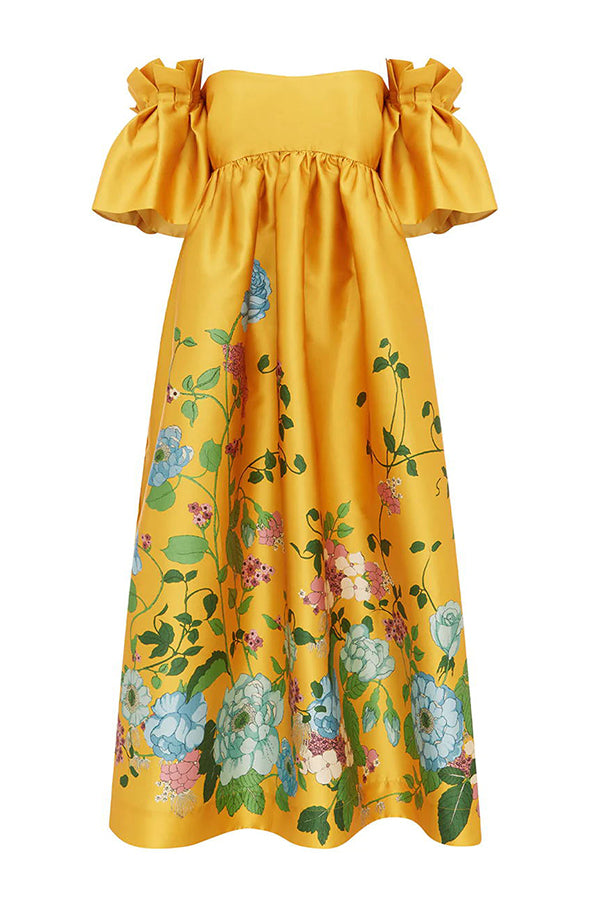 Sweetest Marigold Printed Gathered Sleeve Pocketed A-line Midi Dress